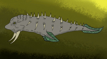 The diet of a Pugnax consists mainly of mollusks and crustaceans, which they hunt for during their long dives. This food is found on the sea floor, usually buried within the muck and sand. To dig out such treats, they use the famed tusks that jut from their lower mandibles. These long, lance-like tusks are actually incisors that have grown out of their jaws, with them actually emerging below the lips. Both the males and females of this species possess these tusks, as they are important for feeding. These two special teeth are grown close together to create one structure, and they are subtly curved upward to make something like a scoop. When foraging, the Pugnax will swim just above the ocean floor, using its keen senses and sensitive hairs to locate prey. When food is detected, they shall use their long tusks to rip up the muck and reveal the hiding morsel. With the scoop-like shape of their tusks, they can slide them under prey and lift them up to send them sliding down to their mouth. Prehensile lips allow them to suck up the crab or clam without letting much sea water get in, and these same lips can let them chew their food without breaking the waterproof seal. Inside their mouths are broad, flat teeth that can crush and grind tough shells, and the whole pulverized mess is swallowed. After eating all they can during their dive, the Pugnax shall return to dry land where it can rest up.