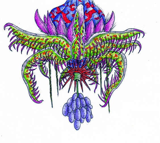 Further examination of these "serpents" will lead you to their "heads." In truth, there are no fangs or mouth to be found in this part, just a whole lot of sticky slime and hairy barbs. At the ends, the tentacle will end in a flexible paddle-shape. On top will be stiff spines and underneath is a whole mess of hooks, hairs and pores. Here is where the "heads" produce a sticky slime that practically drips from their arms. This is no ordinary gooiness, this "dew" is quite adhesive and quickly turns into glue when it makes contact with prey. The bond is quite powerful, making escape from its grip quite difficult. Not only is it incredibly sticky, it also has a nasty little weapon hidden inside. This glue-like substance also contains digestive fluids, which can slowly eat through flesh. Now don't think that it will sear through a limb like powerful acid, because it isn't that strong. The glue that drips from their arms has only a low dose of this digestive fluid, so brief contact will only give you a slight sunburn. Now this does not mean this stuff isn't dangerous, because I should mention that this dew is not all the same. In fact, the gluey dew this plant creates has various mixtures depending on the body part. For these "heads" the dew is primarily an adhesive, meant to create an inescapable grip. A small dose of digestive fluid gives this dew a slight burn to wound prey and obtain a better grasp. On the lower sensory tendrils and at the stalked tips of the "heads" are globs of dew that are very watered down. These drops contain zero digestive fluids, and are held together by a delicate mucous skin. These are not meant for capture, but instead to detect prey. The fine film that holds the dew drop together is sensitive to sound and air movement, and any disruption causes the glob to ripple. With this, the Serpent Nest can "hear" prey approach, as the noise they create will set off the sensory tendrils. The tips of their "heads" also possess these delicate drops, and they use them to better target prey. The running and thrashing of a victim creates a disturbance they can zero in on, and they will lash out to snare them. The other different mixture they possess can be found inside their flowery base. The tips of these opening and closing leaves are covered in glue gobs, which are used purely for adhesive. The further you go in, the higher amount of digestive fluid is present in this fluid. In the central opening of the Serpent Nest, the dew is so soaked with acid that it will indeed burn through flesh. It also has the sticky properties mixed in, meaning that it latches on and eats away like an voracious Slime. With all these different compositions of their dew laid out, it is time to show how they all work in tandem.