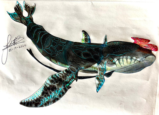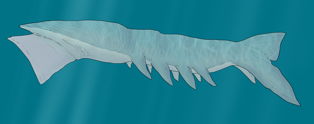 Despite its appearance, the Skieliungur is indeed a whale. It is just hard to recognize it underneath that impressive armor! The other name this species goes by is "Shell Whale," which should tell you all you need to know! This whale is heavily plated with keratin armor, from snout to fluke! Though they are strong, they are highly articulated to allow this beast to properly swim through the ocean. In a sea filled with hungry predators, which often includes other Illhveli, such a defense is crucial! No tooth or claw can break through these shells, making adult Skieliungurs practically immune to predation! Not only is it good for protection, but these same shells can be used for communication. The sound the plates make when rubbing together can be used as an identifier for individuals of the species, as it is supposedly unique for each one. By making purposeful motions, they can practically stridulate! This is how they talk to one another, rattling their own shells to say hello and goodbye! They can apparently say way more than that, but researchers have yet to fully decode such a strange language. One particular thing that is known about their communication is that they may have a word, or sound, for death. We can never be sure of the true word for this kind of language, but it seems certain that this noise is meant to warn of danger. Folk have equated the sound to that of iron being grounded and filed, a rather grating noise. When this sound is used, it gets them all in a panic, desperate to flee from this mentioned danger. It honestly makes me wonder what would get them so scared, especially since they have more armor plating than a paranoid knight!