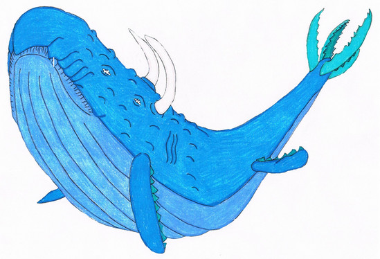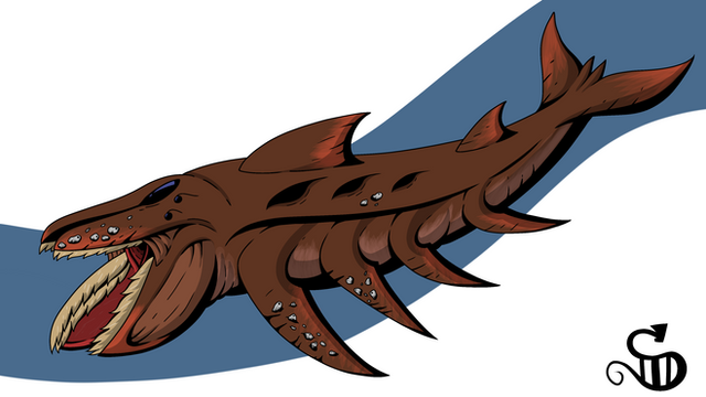 Their armor protects them from being eaten, but what protects the other sea creatures from the Shell Whale? The answer: not much. Skieliungur are ravenous eaters, devouring anything they can get down their gullets. Their mouths are an odd combination of that of a toothed whale and that of a baleen whale. They have a huge gaping maw that can suck in gallons of water, but instead of those hairy bristles, they have teeth! When they open their mouth, they suck in anything in front of them and then shred them in this toothed chamber. The pieces are swallowed while the water is flushed out, preparing their deadly jaws for the next feast. This type of feeding allows them eat anything that fits, be it fish, seals, unwary swimmers and more! Most of the time, they target schools of fish, looking to swallow the entire group in one gulp! They are big beasts, and thus have large appetites! Some have suggested that this shredding maw could be used to envelope larger prey and slowly grind them to paste, but this seems unlikely. First, their actual throats are quite small, so food needs to be cut down to a particular size. And second, such a feeding method would be very awkward and cumbersome. You would first have to deal with a huge thrashing beast trapped in your mouth, and then take the long time to slowly whittle away at them. Gives plenty of time to get hurt by struggling prey and one terrible time trying to swim or stay afloat with such a weight in your mouth! So I think they just stick to a regular diet of fish and the occasional piscivore that might get sucked in along with them.