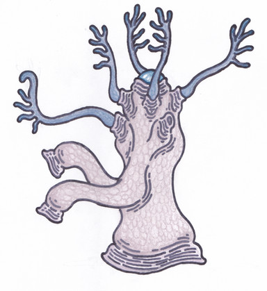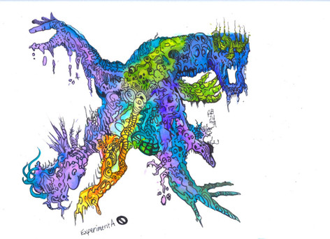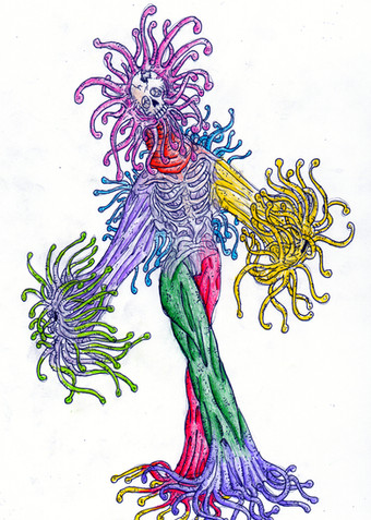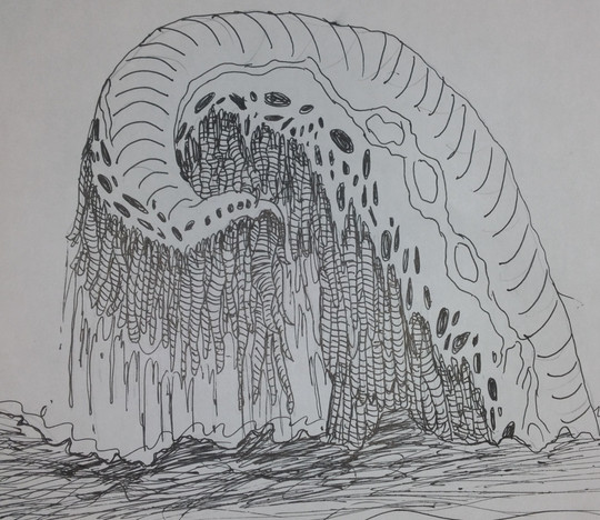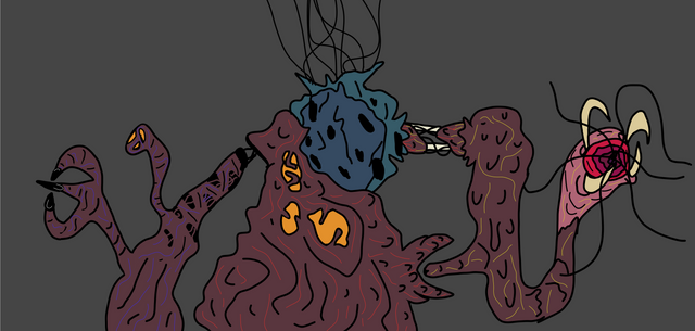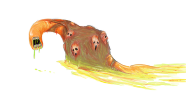 You do not even need to know that the corrupted hearts are obsessed with hunger, as the Slime Dragon's appearance gives that away. A darkened mass of slime that is pretty much a gaping maw that greedily swallows all that stands before it. The slime network will meld and mix with one another, causing the overall color of the beast to be dark and foul. The outer layer will congeal and harden to the point where the slime will dry out and form these dead, brittle plates. Slithering slowly on its single "foot," it will creep through the land looking for food. Though this corrupted beast is sluggish, it makes up for it with its many "tongues" that claw their way from its abyssal throat. These gooey appendages come in all sorts of colors, because these "tongues" were once individual slimes who have been taken over by the Slime Dragon's bestial signal. Like I said before, slimes transfer information through contact, and the Slime Dragon is no different. Any slime who touches this creature will be infected with the rotted signal and they will join the hungering mass. Their pseudo-body and heart will slither into the open maw and turn into a "tongue" to help feed the beast. Slime Dragons can have a varying number of these stolen appendages, ranging from three to over a dozen. When the infected network first erupts from the ground, it often claims a few slimes who are caught off guard by the sudden transformation. Each slime it takes over will add to its arsenal, which it uses to snare prey and pull them into its slimy gullet. Victims who are eaten are drawn into its thin "chest" region, where the harden plates and slime crush the prisoner to a bloody pulp. Consumed nutrients make the Slime Dragon bigger, but it does little to satiate its hunger. Even after consuming a whole caravan of victims, it will continue its hunt for sustenance.