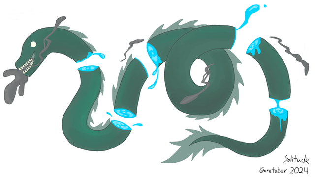 Most of my entries on "dragons" often make mention about how the term has been so overused to the point of meaninglessness. While something may be called a "dragon," it is often not a true dragon. For this entry, I don't think I need to go too deep into this subject. Mainly because you need to only take one look at a Slime Dragon to understand that it is clearly not a true dragon. These creatures are slimes, ones who have been caught in a rather unfortunate situation.Slime Dragons are not a different species of slimes, nor is are they even a sub-species. They are true slimes, but they have taken on this form due to a failure within the slime network. As I stated in my entry about slimes, colonies of this species all have an underground mass that is composed of elderly slimes that have fused together. This combination of hearts and goo receives, stores and transfers information with individual slimes who link up to the network with their pseudo-bodies. These systems are crucial in colonies, as it allows the separate slimes to quickly relay information and learn new skills. The hearts within this mass function just like our brains, and they link up with one another to hold and use a large amount of information. Unfortunately, they suffer the same problems our brains do when we grow old. Though they can live healthily for many decades, sooner or later a heart starts to degrade. Things are forgotten, signals become faded and errors in memory occur. Thankfully, the slime network is made up of several hearts, so they can keep the system running efficiently and make sure no knowledge is lost. In time, though, these weakening organs need to be replaced with another, one younger and more in tune. Most of the times, these dying hearts are quickly crushed within the network and digested so that they may still bring aid to their kind in some way. While this may sound brutal, slimes find it to be a noble end, as they have done their duty and now can truly be one with the network. These ancient organs are removed so the network stays efficient and strong, but they are also terminated because they become susceptible to something slimes call a "rotted signal." This term applies to signals that are taken in and produced by a failing heart that are extremely simplistic and capable of overriding all other information. One slime best described these signals as being like chants you hear from crowds during events. A large mass of people will all have their individual conversations and thoughts, but then one of them starts loudly repeating one word over and over. Eventually it spreads like an infection, causing the individuals to become one loud noise that obliterates all else. These "rotted signals" can say many things, but a common one that shows up in flawed networks gives in to a primal urge. For some reason, the dying heart will give in to this feeling of hunger, and it will quickly spread to the others. Within minutes, the whole network will be overridden and their form will change. Out of the ground will burst this warped creature, driven by an endless desire to consume.