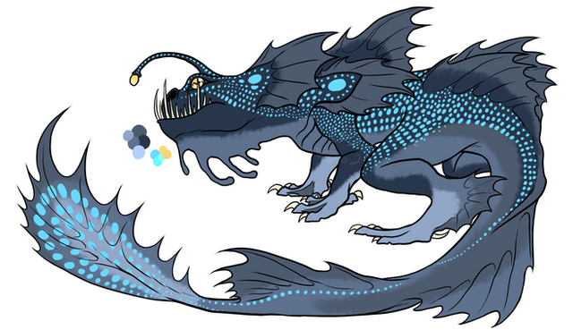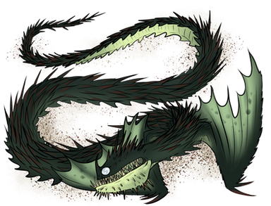The Troglygast is a Piscine Wyvern that haunts damp caves and abandoned mines, waiting in the darkness for prey. Despite their size and the enclosed environment, finding these monsters may prove difficult for those who enter their domain. The species possess an incredible trait: their scales and flesh are almost transparent, allowing observers to see through them. Only their bones lack this transparency, which gives the monster a skeletal appearance. This guise aids them in hunting, as they are ambush predators. By altering their hide, they can make their body almost invisible, masking their silhouette in the darkness. They tend to wait in pools of water or hidden tunnels, using their large eyes to take in what little light exists. While they can simply wait for prey to eventually blunder by, the Troglygast may seek to speed up the process. The tendrils on their head and tail are tipped with bioluminescent buds, which pulse and glow in the dark. By lighting these up and wriggling them through the air, it may catch the attention of prey and lure them closer. When they creep close, the Troglygast will burst forth from its hiding place and seize them in its toothy jaws. Smaller prey will be taken down in an instant, but larger monsters may put up a fight, which this piscine is prepared for. For meals that struggle or predators that target them, the Troglygast will spew forth an icy mist from its maw. This freezing damp cuts through hide and flesh, chilling prey down to the bone. Those engulfed in this fog will find their strength fading, weakening them enough for the Troglygast to move in and finish them off.