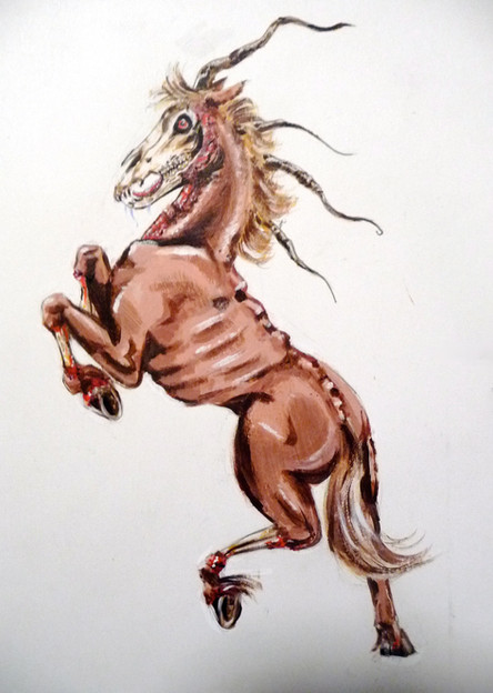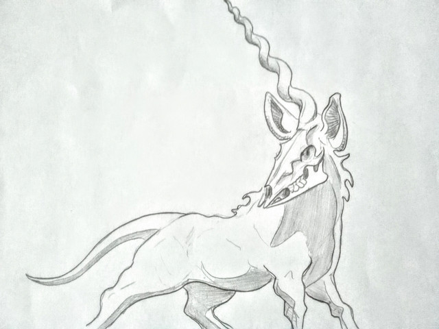 Unicons prey on living flesh, and use their disguise to get close to victims. Unaware and distracted in awe, prey walks right up to the beast, believing that they are approaching a fantastic creature. But when they are close, the Unicon strikes. It can kick at them with their sharp hooves, stabbing and breaking bones. It can tear into them with their teeth, using their strong neck and jaw muscles to lift prey and pull them apart. Sometimes it uses its rat tail to knock down prey and trample them to death. Or it could use its horn to impale them and inject a lethal venom. The horn is hollow, like a snake fang, and the venom sacs shoot venom to the tip, where it is injected into prey. Prey dies painfully and quickly with this venom, and no antidote can save them. Occasionally the Unicon will continue its deception and allow to prey to mount and ride them. During the ride, the side and back spines will jab into the prey, while the rough scales rub off skin. The rider will feel the terrible pain and try to escape, but the Unicon merely tosses them off and finishes the job. After the prey is killed, Unicons will drop the disguise as they feast, and emit a horrifying cackle before and after the meal. Hide, hair and bones are all consumed, leaving nothing but a bloody stain on the ground. After its meal, it lets loose a final cackle, resumes its disguise and its hunt. It seems to enjoy its deception and amuses itself by torturing its prey and killing them in imaginative ways. If a Unicon envenomed its previous prey, most likely it will try to maul the next one to death, because where is the fun in repetition?