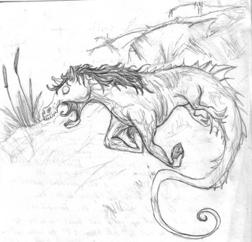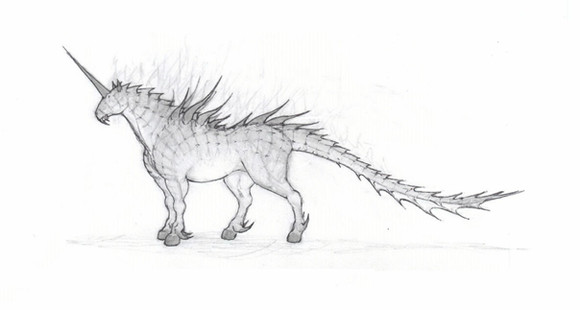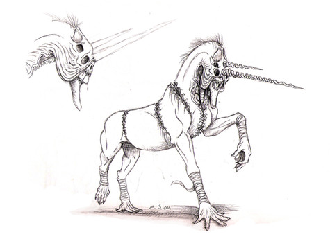 A child plays in the woods, running amongst the trees and critters. But as he plays, he comes across a clearing in the woods, and sees the most beautiful sight. A pure white horse, with a mane of silver and a horn of ivory. A Unicorn. A creature of beauty and elegance. The child is filled with glee and wonder. Such a beautiful creature. He has heard tales of their powers, and how good luck comes to those who see them. The Unicorn turns and watches him, but it does not run. Fascinated, the child creeps closer, hoping that he can get close enough to pet it. With every step, he expects it to run, but it doesn't. He is close enough that he can see its beautiful blue eyes and smell its sweet breath. He reaches out his hand, reaching to touch its head. The Unicorn leans towards him... and bites down on his arm. The child screams in pain, as the Unicorn yanks the child off his feet and throws him to the ground. Before the child can get up, the Unicorn's beautiful ivory horn stabs into him and ends his life. Before the body even finishes dying, the Unicorn digs into the corpse and feasts. If another being was there to spy on the event, they would see the white horse shift and morph as it tears into the small child. Instead of a beautiful, shining horse, they would see a vile, scaly abomination that cackles at its deception. For it is not a Unicorn, but a Unicon.Unicons are terrible creatures that use deception and trickery to hunt. Similar in shape and size with the mythical Unicorn, Unicons use some kind of magic to disguise themselves as such. Be it clouding of the mind, hypnosis, illusions or shape shifting, a Unicon can make itself look exactly like a Unicorn. But the beauty and majesty is a ruse. The soft, white hide masks rough, vile green scales. The flowing mane hides the crest of bony spikes that rise from the neck. The pearly hooves are nothing more then ugly claws, attached to black, bird-like legs. The whipping tail is that of a rat's, split at the end to snare and strike. The twisted, ivory horn is a jagged spear of bone that is hooked up to venom sacs. The mouth houses terrible teeth for biting and tearing. The neck is covered in fish-like gills, and the sides have needle-like bones jutting out. All in all, the Unicon is the exact opposite of the majestic creature of legend.
