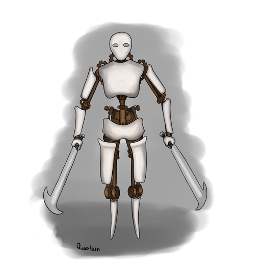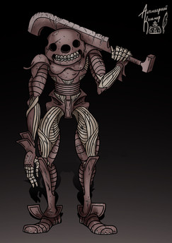 Tales tell of a twisted band of abominations that roam the land, spreading their vile songs to infest towns and corrupt souls. Wherever this horrid group strikes, death and destruction are soon to follow. Though they are monstrous creatures now, the members of this foul band were actually once human. The stories say that they were a traveling band that went from town to town in order to perform and entertain. In truth, though, they were nothing more than talented thieves, using their performances to distract the people while they robbed them blind. Their tricks and charm were legendary, as they fooled entire crowds into believing them as nothing more than simple musicians, even as their infamy grew with each heist. For years they looted and robbed, gaining both treasure and enemies with each passing day. Many wondered if their spree would ever stop, if they would finally call it quits or if the gallows would bring an end to their careers. No one could have predicted the true fate of this infamous band. During a heist on a wealthy collector, the band of thieves happened to snag a rather strange music box in their haul. They knew not what it was, only that it looked expensive and that it would fetch a fair price. Little did they know that it was a Cantatio Daemonum, a vessel for the infernal Voices. They only realized this when they returned to camp, and one of the members opened the box. Brought forth by the screeching tune of the device, the Voices came forth and offered the gathered musicians a single wish. Still celebrating from their recent victory, the band did not realize the danger of this offer and plunged ahead recklessly. Since they enjoyed their life of music and trickery, they wished that they could live this life forever, and the Voices began to sing. At first the musicians believed the song would give them immortality, but it unfortunately brought much more with it. The music began to warp their flesh and tear at their minds. Their bodies were mangled and twisted as the song altered their sheer existence. In the end, the members emerged as horrid abominations, their human bodies and minds forever lost. Infused with infernal powers, they could indeed now live the life of music and thievery forever, but not in the way they had imagined. They would not be stealing gold and jewels from the gullible, but instead blood and souls from the living.Writhem is a member of this band, and he serves as the tempo keeper for their twisted performances. Though he does not create music and songs like the others, the rhythmic ticking of his body acts as his instrument. Every movement of his follows his set tempo, which he speeds up and slows down according to the situation. These very same movements and ticks are what activate his abilities. By moving his hands in a rhythmic metronome-like fashion, he can entrance those who watch these hypnotic arcs. Those caught by this power will be become frozen, unable to move a muscle as long as their eyes are on him. This leaves his victims powerless and helpless, and he takes this opportunity to cut them down. Many parts of his body are razor sharp, and his fingers are just as deadly as an assassin's blade. While his prey is entranced, he will use precise cuts and slashes to disable them and leave behind a bloody mess. Though his hypnotic movements and bladed limbs make him a deadly opponent, he still has one other trick up his sleeve. When faced with tough opponents or resistant prey, he will swing his "head" and "neck" in sync with his arms. When he turns his whole body into a living metronome, he creates a field of influence that locks prey into his tempo. Those who hear the infernal ticking of his head will be forced to obey his rhythm, making it impossible for them to perform any action off beat. Hearts will beat with the rhythm, and victims need to be sure to breath in sync with the tempo or face asphyxiation. Any movements or actions that violate the beat will fail to occur, causing body and limb to remain frozen no matter how hard someone tries. Those who are not good at keeping with the rhythm will become useless on the battlefield, and Writhem's power has easily turned battle-hardened warriors into bumbling fools. To further torment prey, he can speed up and slow down this pace at will, which does the same to the enemy's movements. Ramping up his pace to rapid speeds will quickly tire out foes, and those with weakened hearts may not be able to survive the brutal stress. By slowing down his tempo, he can make enemies move in slow, clunky motions, which makes them easy targets to other band members.