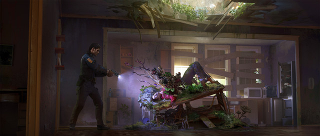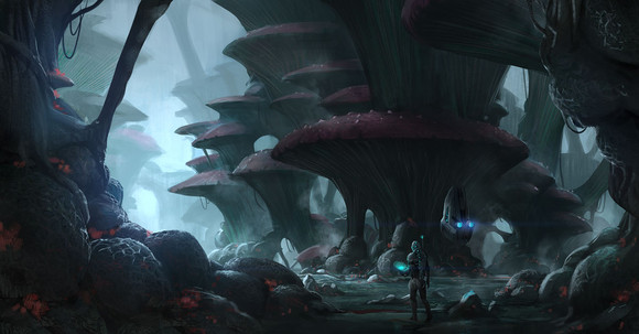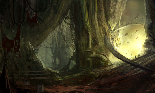 Awesome. I love the setting and transition from the tropical forest on the right to the dark cave on the left. That blue light on the lower right underneath the ramp is very cool as well.