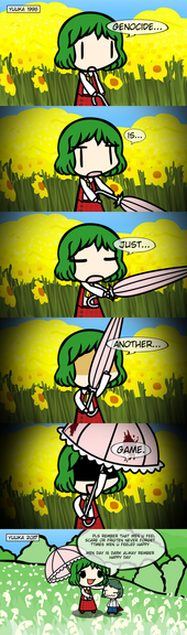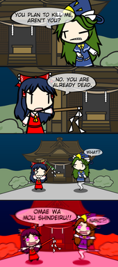 Aka, why Touhou is better. In terms of character toughness, that is. Youkai are extremely resistant to physical attacks, requiring spiritual attacks to exterminate them. And even them, they don't seem to stay exterminated. Unlike the monsters of the underground, where not having physical mass meant that they are vulnerable to murder intent. Touhou youkai easily eat humans for breakfast and required skilled magic and spiritual powers to deal with, in contrast to the Undertale monsters whose entire population can be wiped out by a single determined child. Well, to be fair, a demonic one. But our bloodline descendant maiden also deals with demons on a daily basis.Which brings up something I wanted to point out, that most people seem to ignore. Comparing who would win in a fight from two different franchises without any context is disingenuous at best. Let's use our little fallen child and some monstrous Japanese phenomena as examples. In the underground, Frisk have the ability to save and reset due to their determination, which is something monsters lack. This allows the fourth wall to not exist and create unique game play. However, we also know that Flowey's save ability was neutralized by Frisk's due to the latter's greater determination. Which brings up a question: on the surface, where billions of determined humans live, would Frisk's (or Chara's) abilities even work? Bring them to Gensokyo, a place full of humans with abilities and youkai with unique physiology, can they even scratch them? Inversely, the Great Hakurei Barrier is a logic barrier that protects the youkai from losing influence due to the outside world's increasing lack of faith in the supernatural. Take a youkai to the Undertale underground, and do they start losing power? If people start questioning them, to they disappear in a puff of logic? Place our child and our youkai in a neutral arena with no determination and no faith, and are we going to devolve into a sissy catfight?