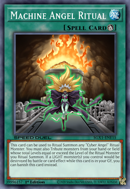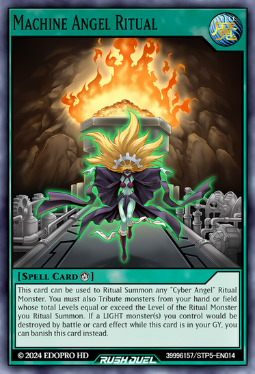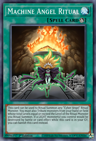 This card is used to Ritual Summon any "Cyber Angel" Ritual Monster. You must also Tribute monsters from the field or your hand whose total Levels equal the Level of the Ritual Monster you are attempting to Ritual Summon.