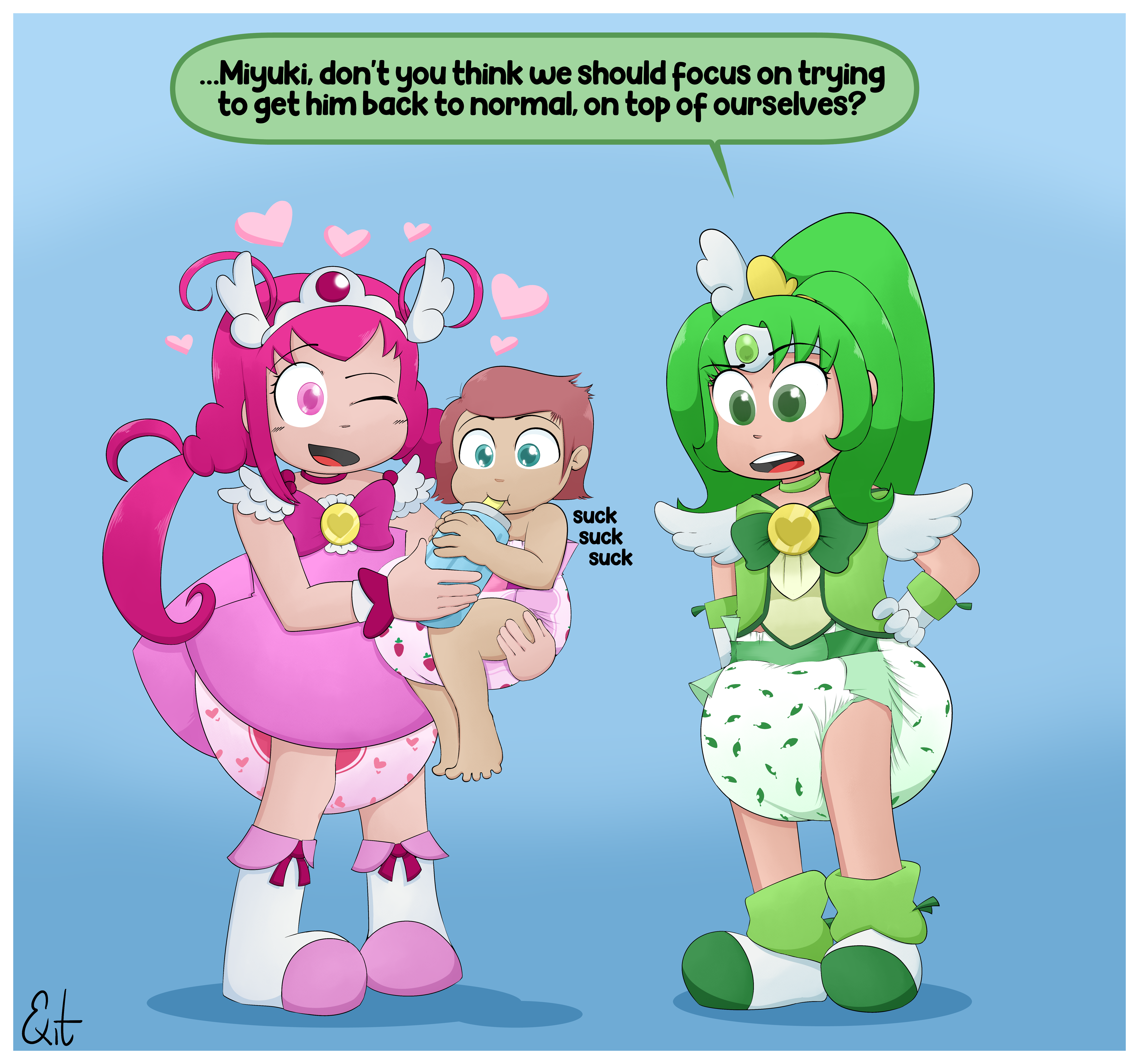 An idea from a friend. Here's Bowsette, shrunken and diapered by a normal-sized Princess Peach, in her nursery. It seems she had plans to make the former Koopa King into a maid. I wonder if the little Bowsette will get out of this?Saga
