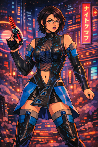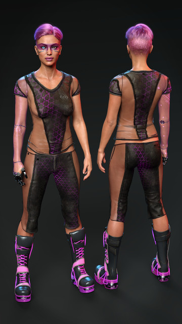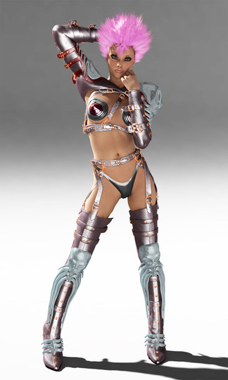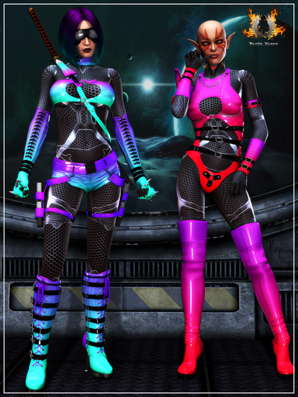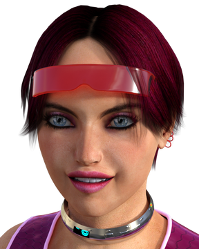 The slave collar is by MJC; her boots, top, and bottom are the Gal-X-E Genesis outfit by 3wComics. The gloves are SickleYield's Free Fingerless Gloves, and the visor is Inception8's sunglasses from the . They are modded in increasing intensity starting with none for the slave collar to modded to heck for the sunglasses, which are now a glowing transparent visor.