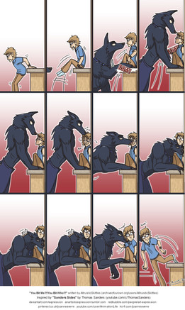 But yeah, you're depiction of Kevin here is super creepy! Super awesome, mind you (you really got his eerie, disturbingly-cheerful personality spot on, internal malevolence and all, complete with a way-too-many-teeth shark-like smile and eyes that either prove he's a demon trying to entice people to sell their souls to StrexCorp, or simply that he has no soul at all and there's just empty eye sockets like a corpse picked at by the ravens and crows....either way it's freaking unnerving like nothing else), but definitely also super creepy! Cecil's expression here is perfect (poor guy really looks like he wants to be anywhere else but within anywhere in the vicinity of Kevin).