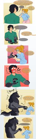 Although I've drawn fanart before related to this fic (see here: www.deviantart.com/expression/… ) and I was pleased with it, as I neared the end I did think, "No, it's no good. The urge to draw this whole moment is just too great."So, to reiterate, this is a scene from "You Bit Me?!" a Sanders Sides (werewolf/vampire au) fanfic by Altruistic Skittles in which as the Sides-inspired characters are attending college, Logan is accidentally turned into a werewolf and transforms a few days later in front of his, definitely surprised, step-brother Patton!