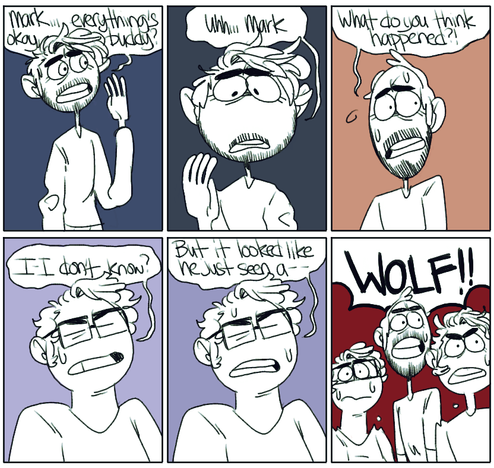Although I've drawn fanart before related to this fic (see here: www.deviantart.com/expression/… ) and I was pleased with it, as I neared the end I did think, "No, it's no good. The urge to draw this whole moment is just too great."So, to reiterate, this is a scene from "You Bit Me?!" a Sanders Sides (werewolf/vampire au) fanfic by Altruistic Skittles in which as the Sides-inspired characters are attending college, Logan is accidentally turned into a werewolf and transforms a few days later in front of his, definitely surprised, step-brother Patton!