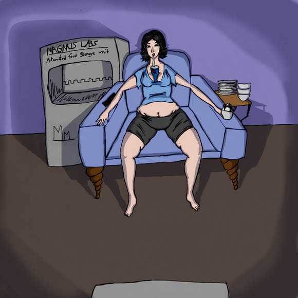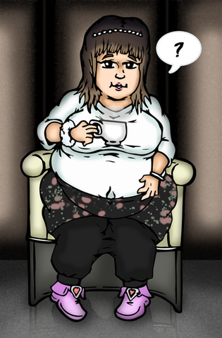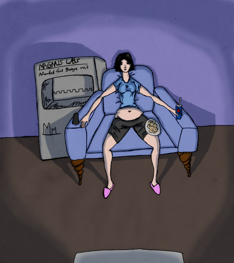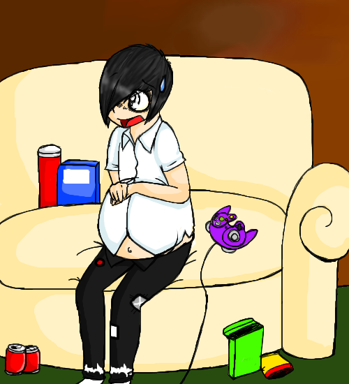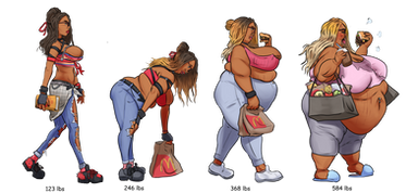 Lisa from the donation contest! As you can see, she's doing a good job embracing the laziness of her new lifestyle, and as such has definitely taken the lead out of the three of them! She's lounging, eating junk food and is turning out to be apple shaped, with a prominent gut taking up most of her size.If you like her the best, click to help make Lisa the biggest! One dollar is two pounds, and if you donate ten or more very dollar is worth three! Any donation is greatly appreciated, and helps me continuing my own work and art for all of you