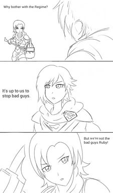 Ruby by is not cool with the idea though, because she was the only one who knows Neo as a villain, but she reluctantly agrees with keeping her around as long as she doesn't hurt her or the group. She also doesn't like how close Neo is to Jaune