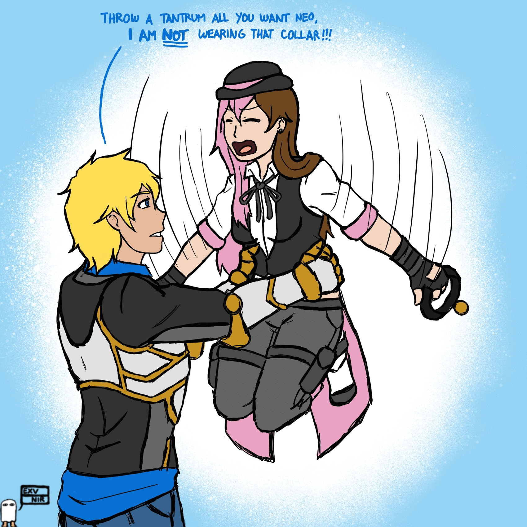 Potential spoilers for RWBY Volume 7 perhaps? LOLJaune fights Neo, gets squished by her thighs. To her pleasant surprise, Jaune’s actually wanting her to go tighter. Everyone else who had her legs around them always pleaded to be released. She’s shocked, is all.