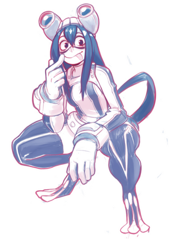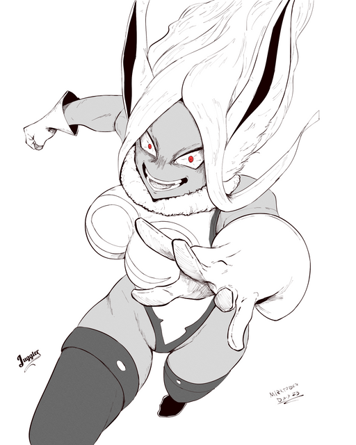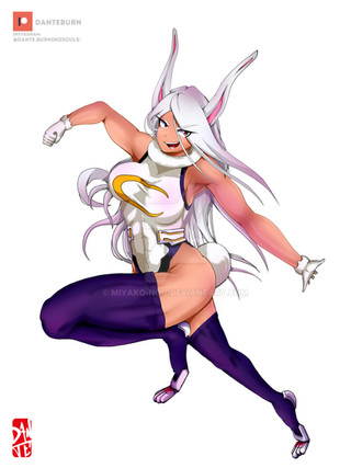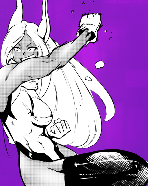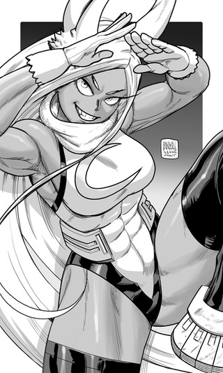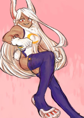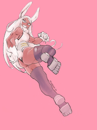 I appreciate your use of soft pastel colours to contrast the smoothly executed, and therefore menacing, figure. One comment should be about Miruko's hips. They seem to allow her legs to spread towards the foreground and background of the picture, almost looking like she could fall down any moment to accidentally do splits. To me, those legs are in an uncomfortable position. I'd say, "draw her right leg at less of an angle, so to ensure stability". Regardless, this is some decent figure-work going on.