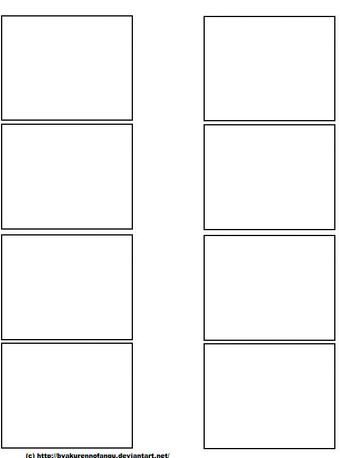 A full sized sheet like this fits two chapters. I'm using the typical manga chapter length, which usually has at the max 24 pages. But in case the chapter is bigger than that, the bottom part can be used. So, this can be used for two max-24 pages chapter or a single max-48 one. Of course,it could also be used to draw 48 individual chapter covers. Or maybe you can use the first box to draw the chapter cover and then the others to do the pages. Whatever works best.