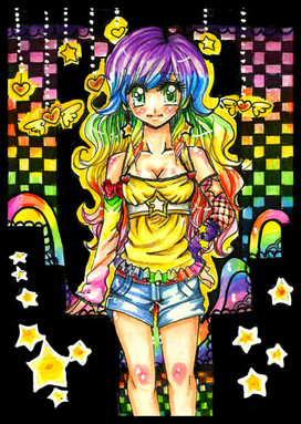 This caught my attention for many reasons. Obviously I like the colors as everyone does but there are many other reasons to like this. There are so many shapes in this picture. Music notes, many pentagram type stars and animals like the rabbit and cat on the shirt and the pig near her head. There are rainbows all over and a sun, rain and a bunch of hearts. It's like you took everything you've seen in your whole life and put it all into one picture.