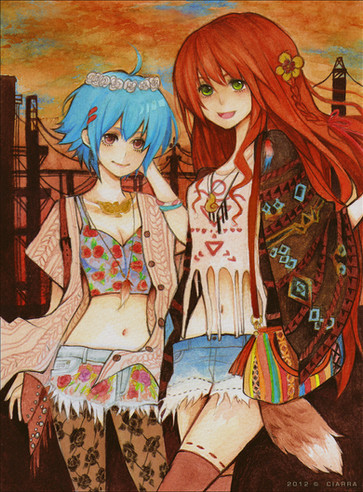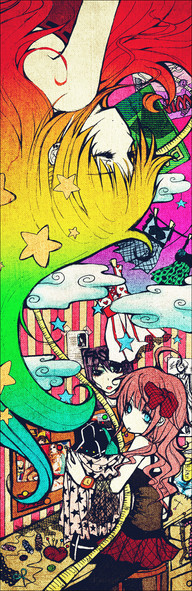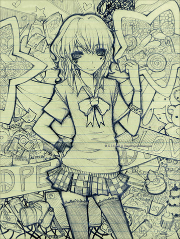 This piece is bursting with colors and detail, and it's helpless to not get lost in this work of art. Colors and music pop-out from everywhere, details are evident in the shading of the clothing. The contrast from light to dark colors, as well as the transition from one color to another are next to perfect. The character is so cute her pose makes her even cuter.