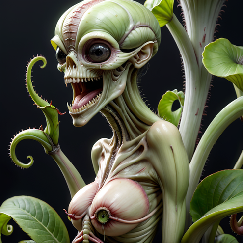 #ai #alien #anthropomorphic #artwork #ature #dark #hybrid #illustration #irreal #paint #painting #strange #surealism #surprise #transformation #transmutation #art #anthro_plant #ai_art #ai_artwork #fabinus08 #carnivorious_plant #hybrid_human_plant