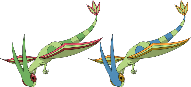 Skies Dex description- A sturdier breed than the Amare variant, these Flygon have been known to fly long distances across harsh deserts. Their flapping wings are known to sound like singing
