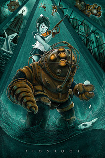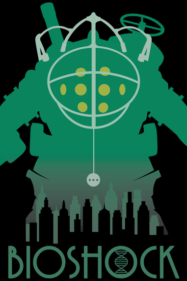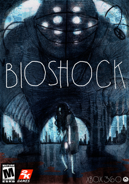 I used 2 textures the first being India Ink and the other is from a Photograph of dried up soil. The Poster includes a lot of things from the game such as the plane crash, entry tower, submarine, Rapture, Big Daddy & Little Sister. Credit goes to the creators of Bioshock for the Concept
