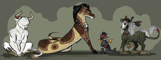 Wow, I loved the design for these creatures originally, but dang you really made them wonderful. Okay, so, what I think is happening is the more bunny-like male with the nice accessory is showing off to the dark, marbled female, and she thinks he looks a bit silly with his tough face on, while the pale male thinks he looks adorable showing off like that, the pale one probably has a bit of a crush on the bunny, but the left female is upset that these two guys decided to burst in on the females' little outing. Besides, all of this showing off is stupid, and she is not amused.