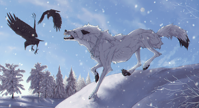 Commissioned byHer fox/raven character wandering through a winter wonderland, followed by a trio of ravens.