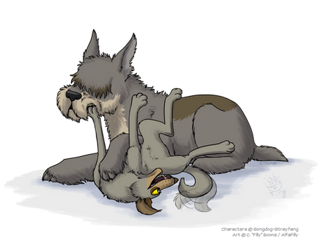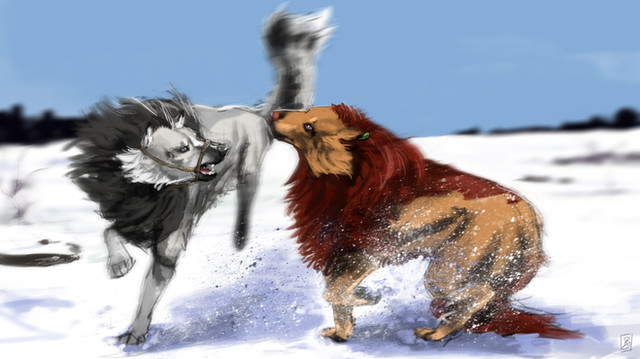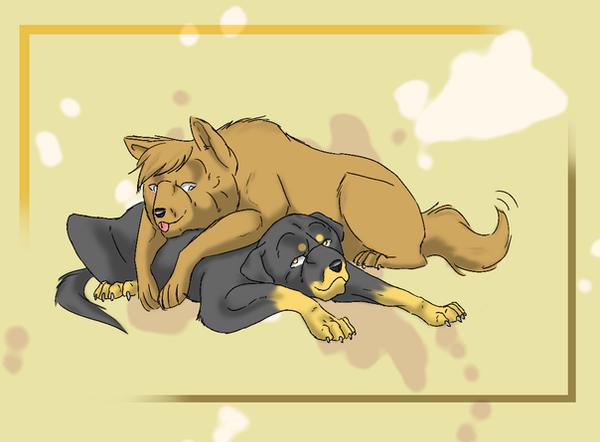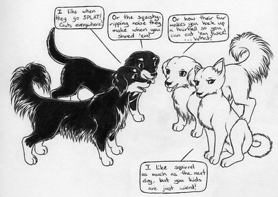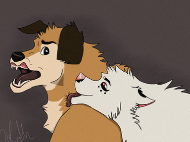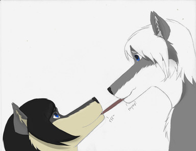 Shadowwolf is silly! Very silly! And so is her fursona, Shaddie. You gotta love the pooch who goes 'fweee!' So I wondered what would happen if Ravage (my pit-greyhound mix character), an equally silly canine, met Shaddie.Flying spit! Yay!