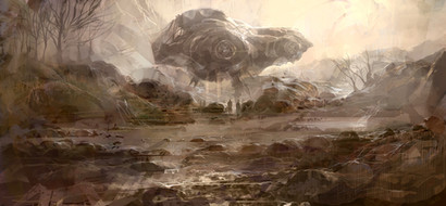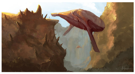 Nice stuff, I like the atmosphere of that shot and the overall viewpoint. The colours create a nice harmony as well. however, I do think that the forground elements could still be a bit smaller to emphasize the scale of the scene. And as much as I like the flare, I think it would probably be broken up a bit by some shadows in the forground rocks and come through in streaks...but otherwise, good work