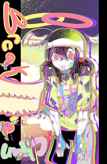 I love the background, I like the subtle city scape behind her and Saturn up there in the corner ;w; I love her spiky halo and cool wings too!