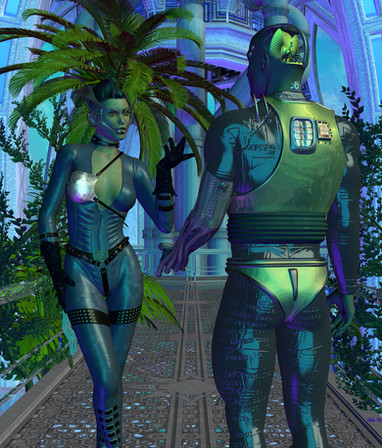 An android and a robot doing a study of earth's flora. Β They are fascinated by the cactus!Rendered in Iray.