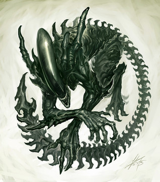 Finally a proper Xenomorph artwork! HR Giger's designs inspired my artistic style very heavily; for several years when I was young I drew nothing but aliens! It's about time I posted a tribute to the greatest monster of all time!I sketched the alien first with pencil, then painted it with acrylics, and finally scanned it and added the final touches in photoshop. I was inspired by some of the Aliens movie posters with chest-bursters and the like shown in a similar pose. No references were used and I gave it a bit of my personal style, so it isn't an exact replica of the original Alien designs by any means.