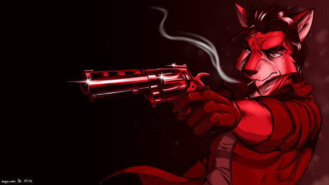 I agree with *Halothane . His expression and the tail between his legs, as well as his stance definitely makes him seem nervous/scared/timid. At first glance, the guns don't make you think that. Excellent job!