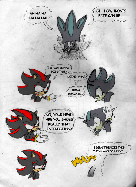 Ooohhh ok... bad Sonic, sicne Shadow is unable to kill you right now I'll do it myself. *pulls out a sword that seems to have dark aura around it*