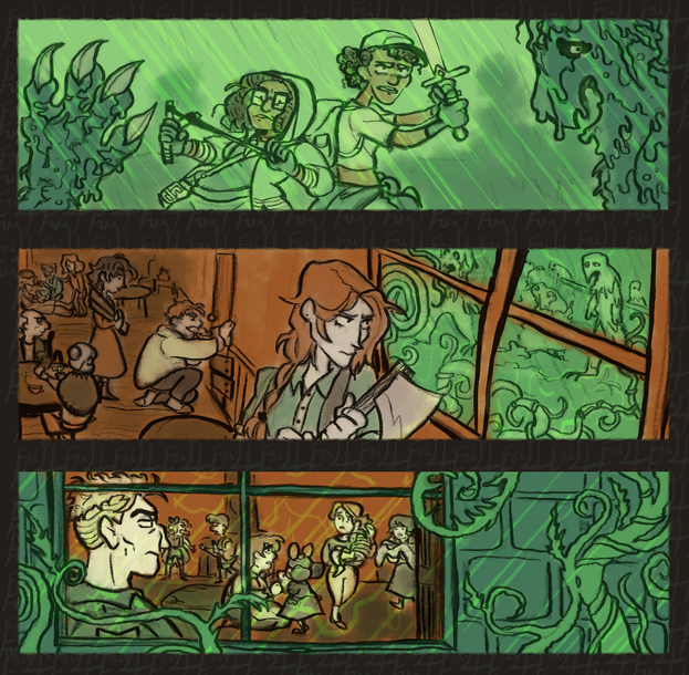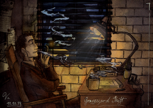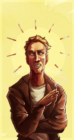 I gotta thank Caffinated-Pinecone for the cover and fanarts they provided of some of the key characters. What a treat! I'm not exactly that confident on my ability to stylise this franchise (although Voxbrose gave me plenty references for the designs, thanks to him too!), the artwork for the games are extremely detailed so finding where to cut off isn't as clear for me. Had to stop myself from going overboard with the shading or details (even then, it is a wee bit ludicrous how much the light from the flame does whatever it wants, eh? also yes I am fairly aware fire doesn't just stay lit like that in a smoking pipe). I'm working with an even more restrained pallette than before and I just wanted to make it look sort of alien but not too much... I love unrealistically colorful smoke. Well, this is the tweaked version since the colors I actually used had a slightly different effect to them : For comparison's sake, look' it .