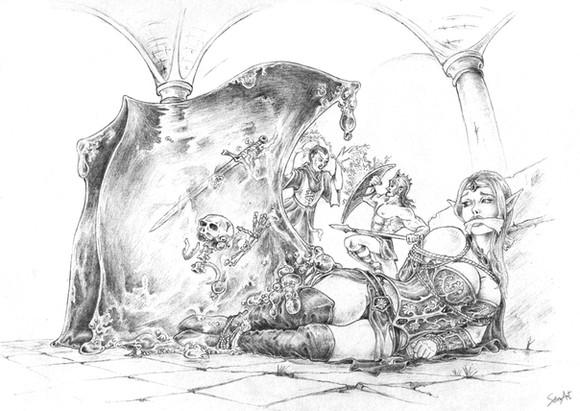 I think this is another exceptional image - Zirena is looking suitably inscrutible and Jervil's expression (while holding what I assume is Zirena's gag) is wonderful. I admit, that being base, I'd have liked you to pull back a little and reveal more of the lovely seeress... but I really can't complain, this is beautiful.