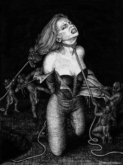 Excellent! The way it should be, the look of terror on her face, and the merciless look on his. Could never understand the idea that a woman would be aroused by having her throat torn out. Great pose here, and I love her sexy dress, with the low neckline and lots of cleavage. Reminds me of Hammer studios.