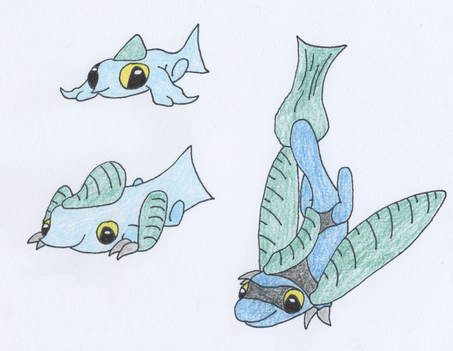 FakeDex: Fluttrdile share common ancestry with pokemon like Crokyle [link] and Meguroko. They branched off from the crocodillian family millions of years ago and gained the ability to fly. They spend most of their lives flying through the sky and their limbs are all but residual.