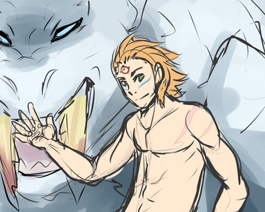 Puede ser las dimensiones que Kepri sea tan grande y robe tanto protagonismo que deja a Usul de lado cuando él debería ser el protagonista, no armonizan bien, es una pelea, la composición es importante en el dibujo y te destruiré al respecto , quizás si kepri no fuera tan brillante, no se si como efecto de marca de agua, quizás si lo hubieses manejado en sepia no impactara tanto... porque esta centrado, es grande y es brillante, es para decirle a Usul "quítate de alli, que estorbas para la foto" y no debería ser, porque el dibujo se llama "Usul"XDDD!! y en el dibujo quien sobra.... es Usul, es una pelea de protagonismo que tu moreno no gano aquí, y en proporción (el descaro hablando XD) Usul tiene los brazos algo cortitos, aunque tenga los puños cerrados, no es excusa.