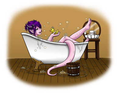 Since you requested critique... I have to admit... being a fan of your comic and the character... flaws in this image are hard to find. About the only flaws I saw is some of the shadowing might be slightly askew... like the shadow on the shampoo bottle seams a little off... and I only noticed THAT because I was really looking for it. Even that might be an error on my behalf. Love the slight shift to the foam highlights to match the lighting angle. Gotta love that seductive look on her face. Heh heh... not many people could make a GOBLIN look sexy. Keep up the excellent work! Oh... and might wanna remind Nitrine that she's going to ruin her gloves like that...