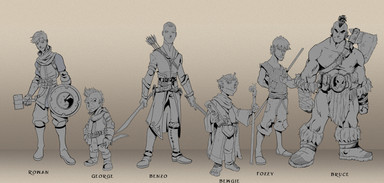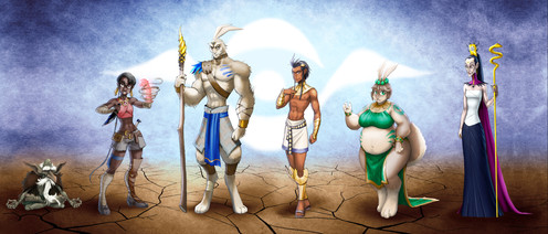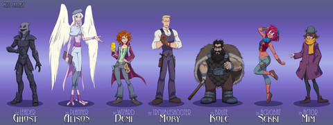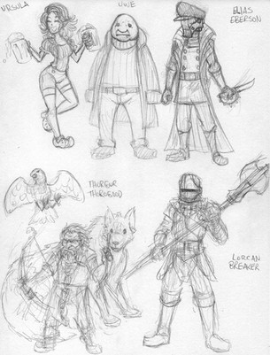 I was already thinking of a party who's leader would be a tough, serious, non-sexualized woman (Tern), then a random generator gave me the idea for a Chaotic Neutral Sorceress named SANE, of all things... then the generator in question failed to deliver anything else inspiring, so I had to invent the rest by the age-old method of filling out the party with all the different roles!