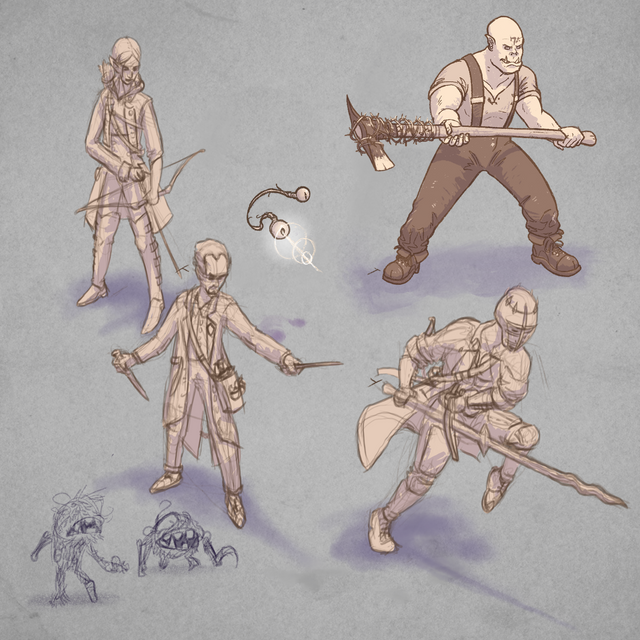 Dowl Fairmeadows (True Neutral Half-Elf Rogue) is a random drifter who happened to be there when monsters happened. Hides a number of knives on his person. Surprisingly good at sneaking despite his looming stature. Hates his elven surname.
