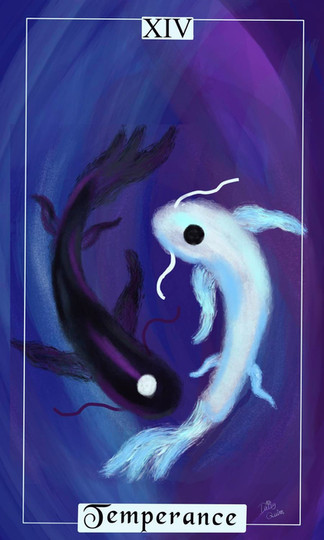 The eight and last piece of my Avatar Tarot series (and the one which was easiest by far) features the Moon and Ocean spirits, in the shape of eternally circling koi fish. I loved the part they played in the book one finale, which was really exciting and, in my opinion, the point at which the Avatar series grew the beard and started getting good. I actually finished this ages ago, and it was real easy to do, compared to the other drawings in this series. What I did when I finished it yesterday was merely to write the title at the top (though rather badly, I have to admit) and sign it with a wildly inaccurate date. And so now I've finished the entire series! Woo!~