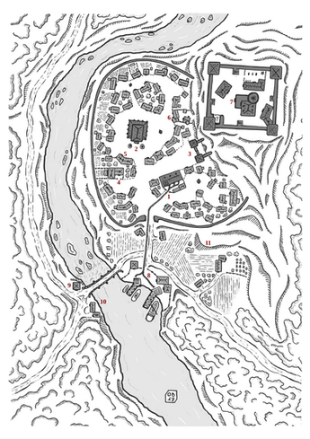Trying my hand at a few different new things for this map: this is my first use of Rendr no-show all media paper, first attempt at making a map with parchment-style borders, first attempt at a more monochrome parchment-style color palette, first legend, and first attempt at a side view of the village. It was a fun experiment.