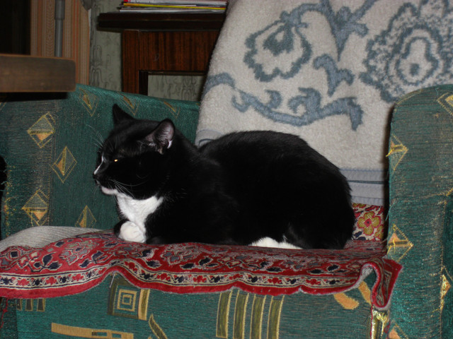 My cat Mohrle relaxing on my parents sofa. She lives around and in my parents house, she didn´t moved with me because she´s an outdoor and semi-wild cat.Love her, she´s very cute and pretty!
