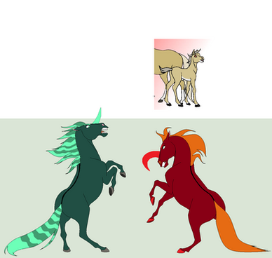 An old sketch that I found while going through my things. I think there was supposed to be a third horse, but I couldn't remember who. Sorry about that. In any case, didn't bother fixing the lines or anything, just tweaked some things here and there to fit my current style, so they probably look kinda funny since it's an older sketch. Anyway, I'm pretty sure this came up in the CW chat and then I drew it. Was going to be a collab, but it never happened so I just finished it.