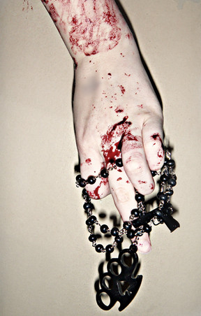 The newest obsession of mine: Stigmata. It fascinates me. The whole idea of it. Also an expressive portrait of why we, as humans, are so frail and fragile. Organized religion. Not belief in a god (do not confuse me and accuse me.), but belief in a dogma. Belief in a system composed by man. Man. If the only perfection is a god, then men are imperfect. Therefore, all things created by man are imperfect. Hence, organized religion is imperfect. We are imperfect due to the differing opinions among us. Religion is an opinion. It is an interpretation. "The Holy Bible" was written by man, was it not? Do not try to tell me it was written by the almighty, because, though it may have been spoken from the almighty (if you can believe that), it was interpreted by a man. A lowly man, at that. And that was in a completely different language. When translated to English, I'm sure a lot of things were missinterpreted. Thus the phrase "lost in translation." You can't get the same effect when switching languages. The basis behind this all-powerful religion (Yes, I am speaking distinctly of the Catholic/Christian religion. I don't know enough about any other religion to argue it.) seems rather intelligent. Keep everyone alive. Except the weak. God will take them. That goes along with our instinct. If we all stay alive, then we have more people to mate with and more chances to spawn. Alas! According to this book, we cannot have sex? Well...how does that fit in to the scheme of things? This book was written by a misanthrope! No sex? It's an end to the human race. How do we have children? We don't. Instead, we live our lives in service to this omniscient god. And in one generation, the human race would END. Religion goes against what we know to do. Though shalt not murder. Unless in the name of god. What if in the name of self-protection, self-advancement--in the name of self? We are god. We are what we worship because we are all that matters. But we've personified that idea through a storybook into a large white man with a beard. A white man with a beard whom you can only see if he wants you to, and whom you can hear inside your head. Let me put it for you simply: Religion is an undiagnosed form of Schizophrenia. No kidding. It was written by a man who was hearing voices. Voices that told him what to do, and what not to do. Voices that made him harm others. The Bible is in painstaking detail, and is thousands of pages long. How could a sane man do such a thing? He couldn't. The insane reign supreme. And the only reason for the negativity of that statement is the fact that the insane are self-consumed. Paranoia is a fear of everything but yourself. It's the idea of advancement of self taken to an ironic level. If you fear others, you can't keep your species going. And therefore, my dear public, organized religion was meant to kill us, not keep us going. In the end of all this ranting, you may find a twist, by the way. So keep an open mind.Anyway. Glad that's over with. I may be putting this piece in that big thing I've been telling you all about. However, it's kind of bloody. I tried so hard to stay away from the blood, but I couldn't. I like the effect I put on it with the lighting. To make it look very dark and almost like an amateur video of this miracle.
